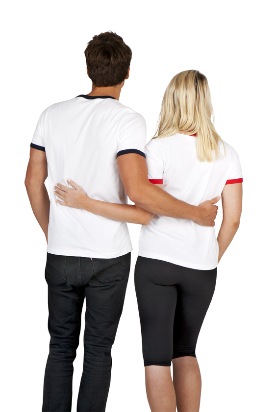 Contrasting ribbing at neck & sleeve hems, side seamed, shoulder to shoulder tape, double needle hems, preshrunk to minimise shrinkage